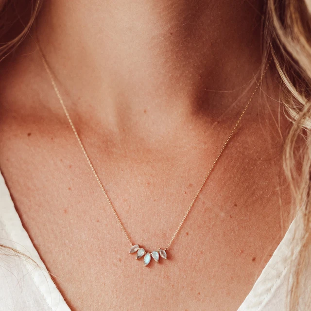 Pear Marquise Rainbow Moonstone Curved Necklace 14k Gold Plated Crown Moonstone V Necklace for Women