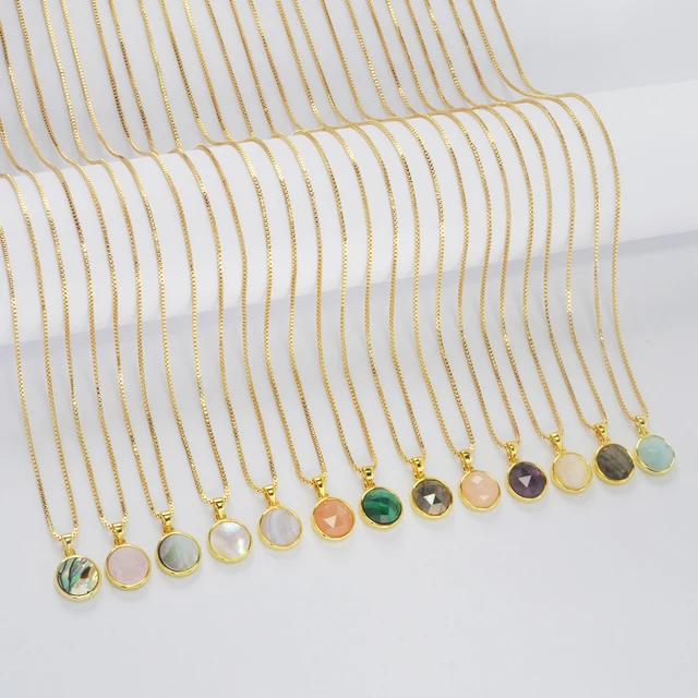WX984N Round Shape 18K Gold Plated Brass Box Chain Mother of Pearl Shell Coin Pendant Necklace Women